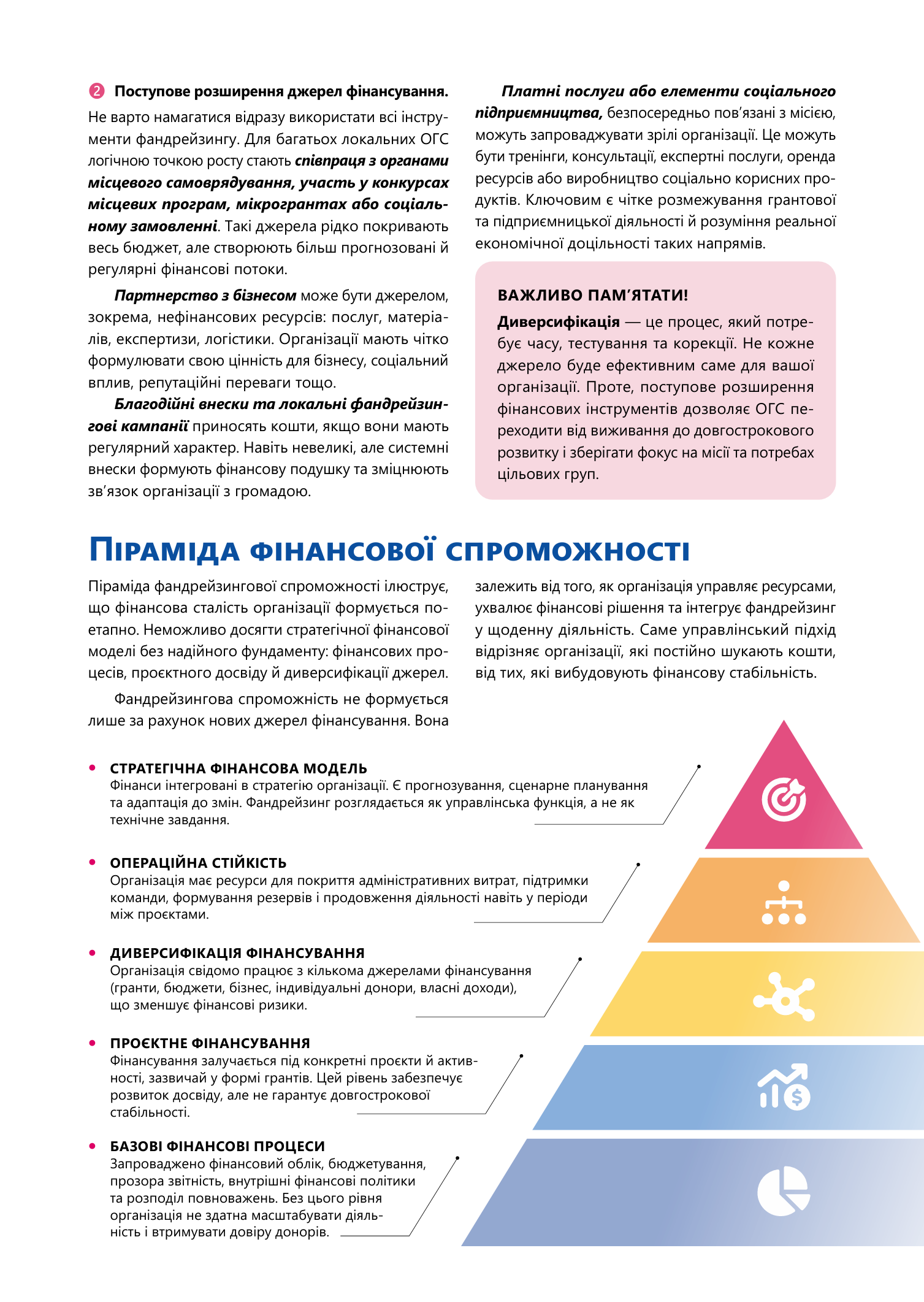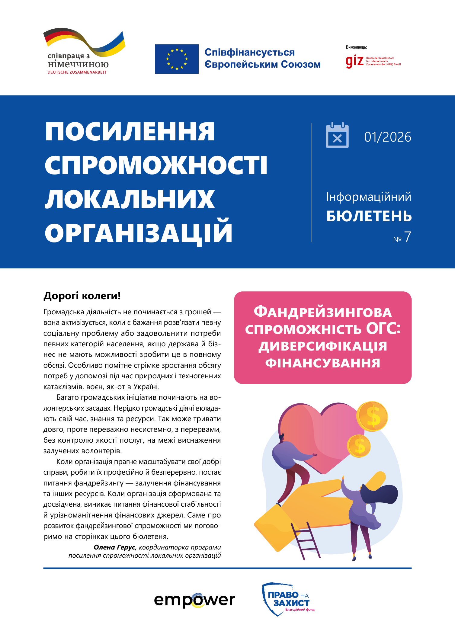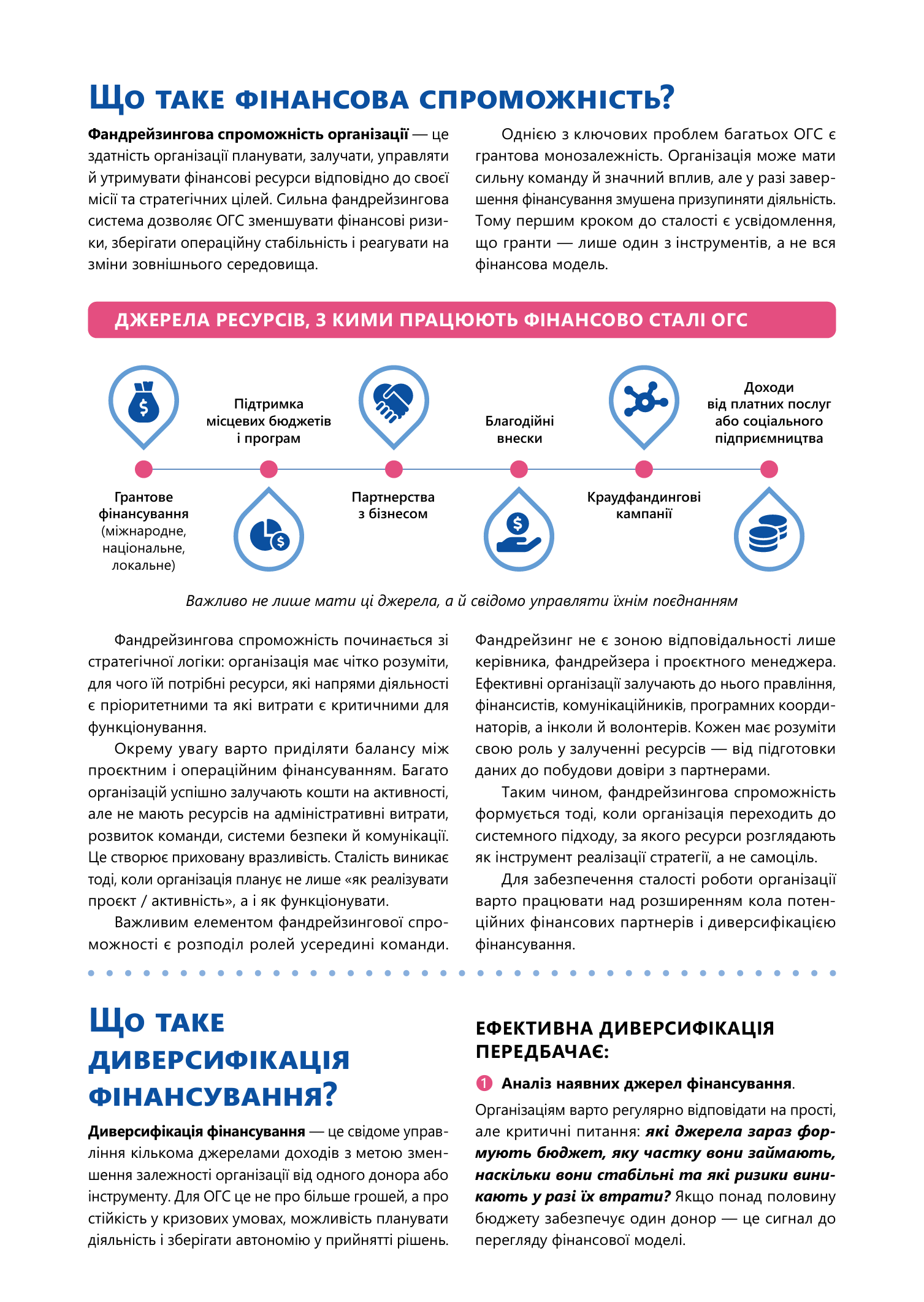 Коли організація прагне масштабувати свої добрі справи, робити їх професійно й безперервно, постає питання фандрейзингу — залучення фінансування та інших ресурсів. Коли організація сформована та досвідчена, виникає питання фінансової стабільності й урізноманітнення фінансових джерел. Саме про розвиток фандрейзингової спроможності ми поговоримо на сторінках цього бюлетеня.