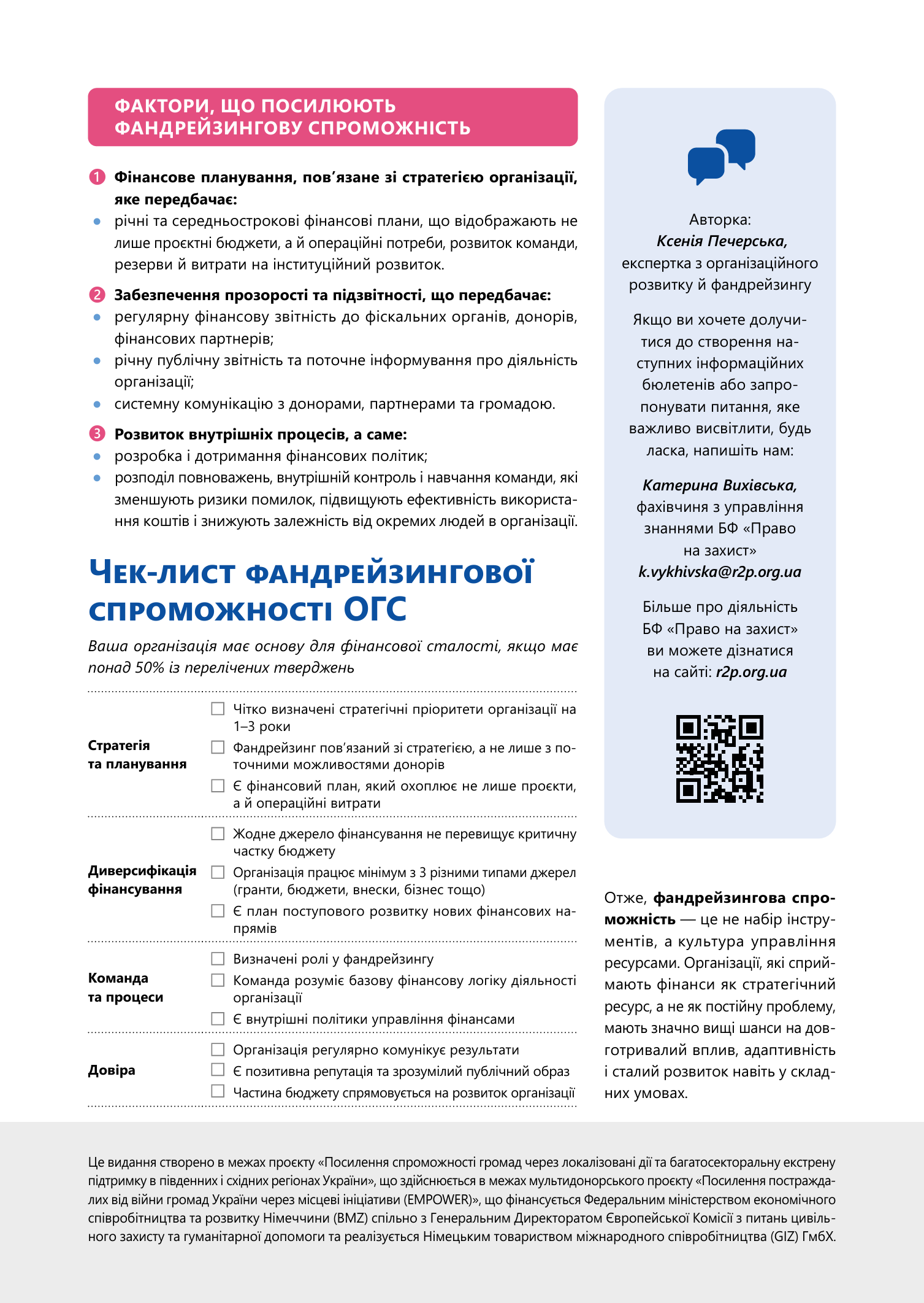 Це видання створено в межах проєкту «Посилення спроможності громад через локалізовані дії та багатосекторальну екстрену підтримку в південних і східних регіонах України», що здійснюється в межах мультидонорського проєкту «Посилення постраждалих від війни громад України через місцеві ініціативи (EMPOWER)», що фінансується Федеральним міністерством економічного співробітництва та розвитку Німеччини (BMZ) спільно з Генеральним Директоратом Європейської Комісії з питань цивільного захисту та гуманітарної допомоги та реалізується Німецьким товариством міжнародного співробітництва (GIZ) ГмбХ.