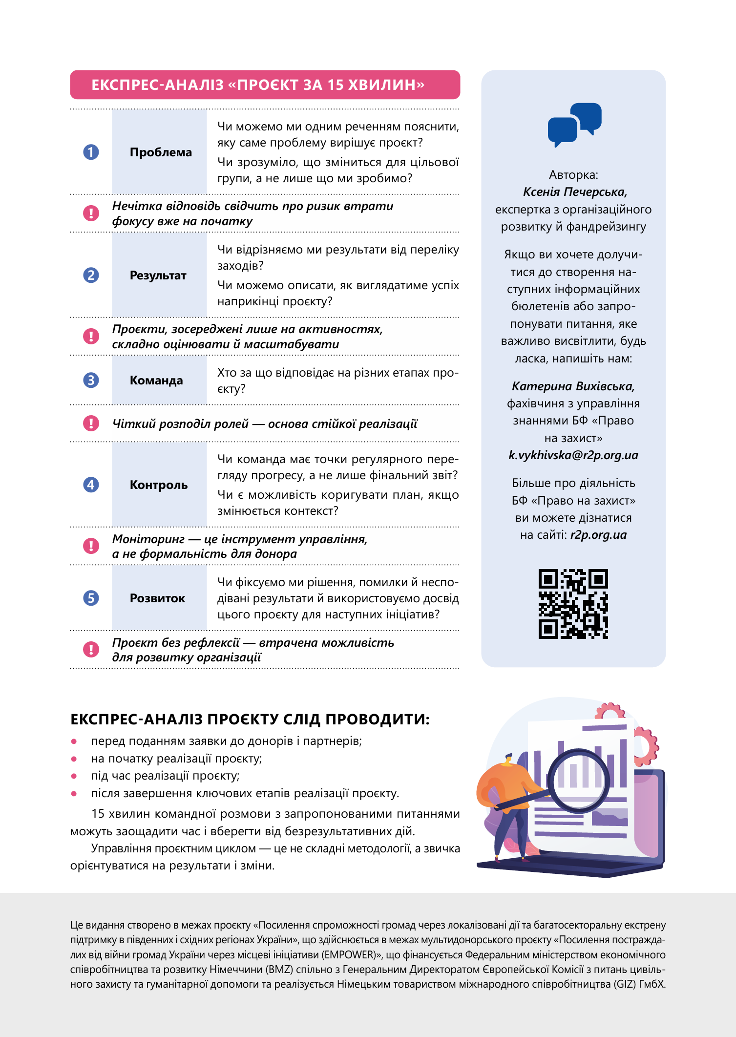 Це видання створено в межах проєкту «Посилення спроможності громад через локалізовані дії та багатосекторальну екстрену підтримку в південних і східних регіонах України», що здійснюється в межах мультидонорського проєкту «Посилення постраждалих від війни громад України через місцеві ініціативи (EMPOWER)», що фінансується Федеральним міністерством економічного співробітництва та розвитку Німеччини (BMZ) спільно з Генеральним Директоратом Європейської Комісії з питань цивільного захисту та гуманітарної допомоги та реалізується Німецьким товариством міжнародного співробітництва (GIZ) ГмбХ.