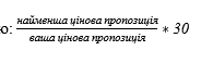 розраховується за принципом «чим менша ціна, тим вищий бал» за формулою: